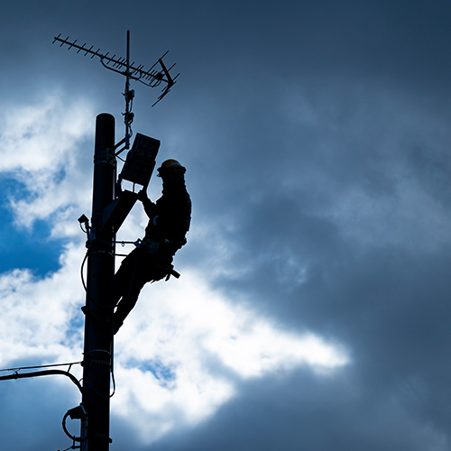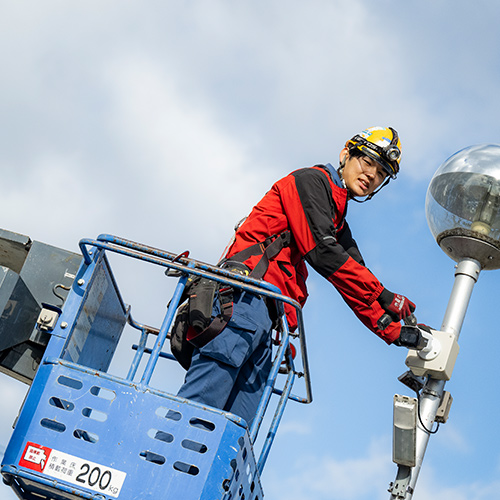 電気工事に付随する土木工事まで一貫して行います。道路照明や街路灯の基礎工事から建柱、地中埋設管路の掘削や配管、ハンドホールの設置、屋外キュービクル式受変電設備等の基礎や鉄骨架台の設計製作から施工まで行います。